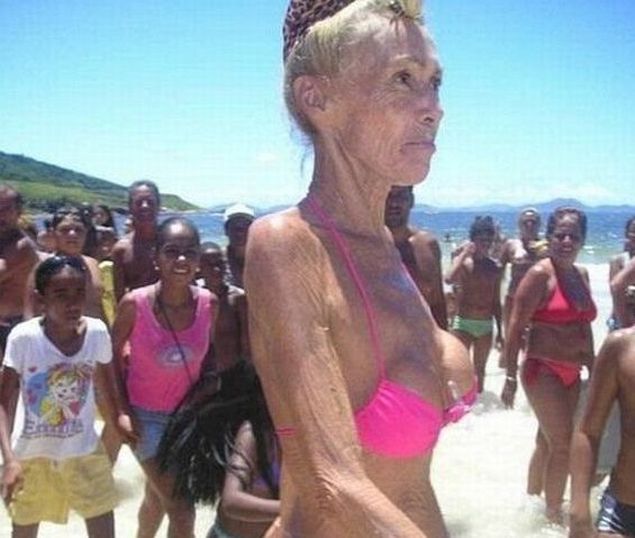 Cand a aparut babaciunea asta pe plaja, toata lumea s-a holbat numai la ea. Are peste 60 de ani, pielea atarna pe ea in ultimul hal, dar s-a tunat. A vrut silicoane si n-a tinut cont ca "aroganta" asta nu e de nasul ei.