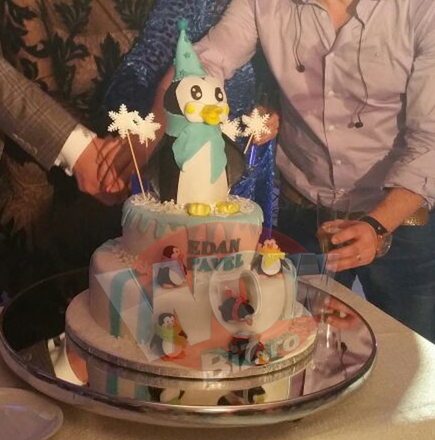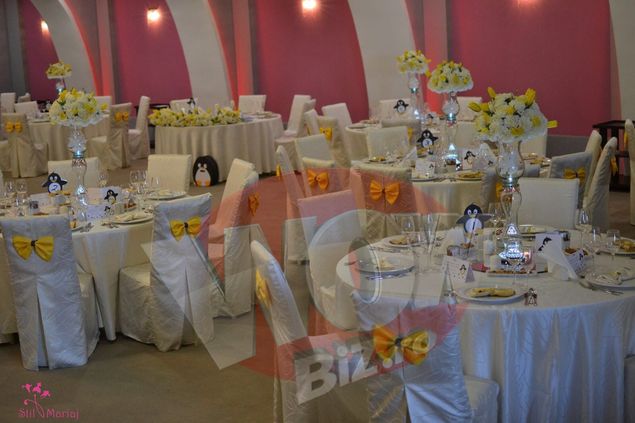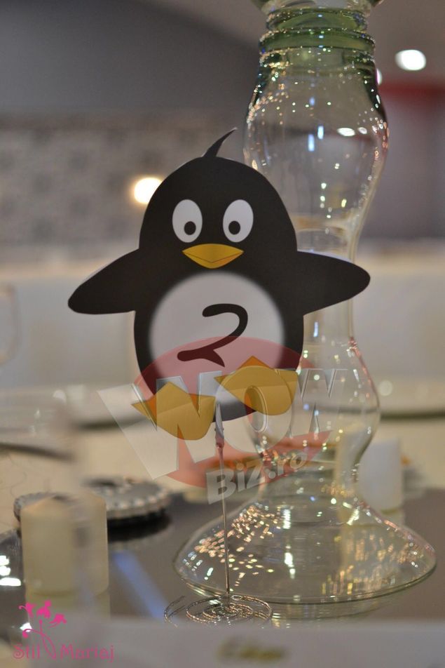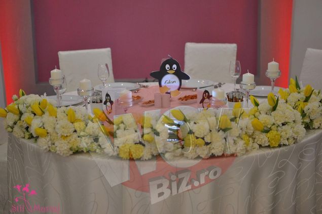 De la biserica, toata lumea a plecat spre un ballroom de lux unde urma sa aiba loc petrecerea. Acolo, invitatii au fost suprinsi de aranjamentele superbe, intr-o combinatie de flori albe cu galben, la care organizatorii au adaugat si mini jucarii in forma de pinguini, speciale pentru botez.