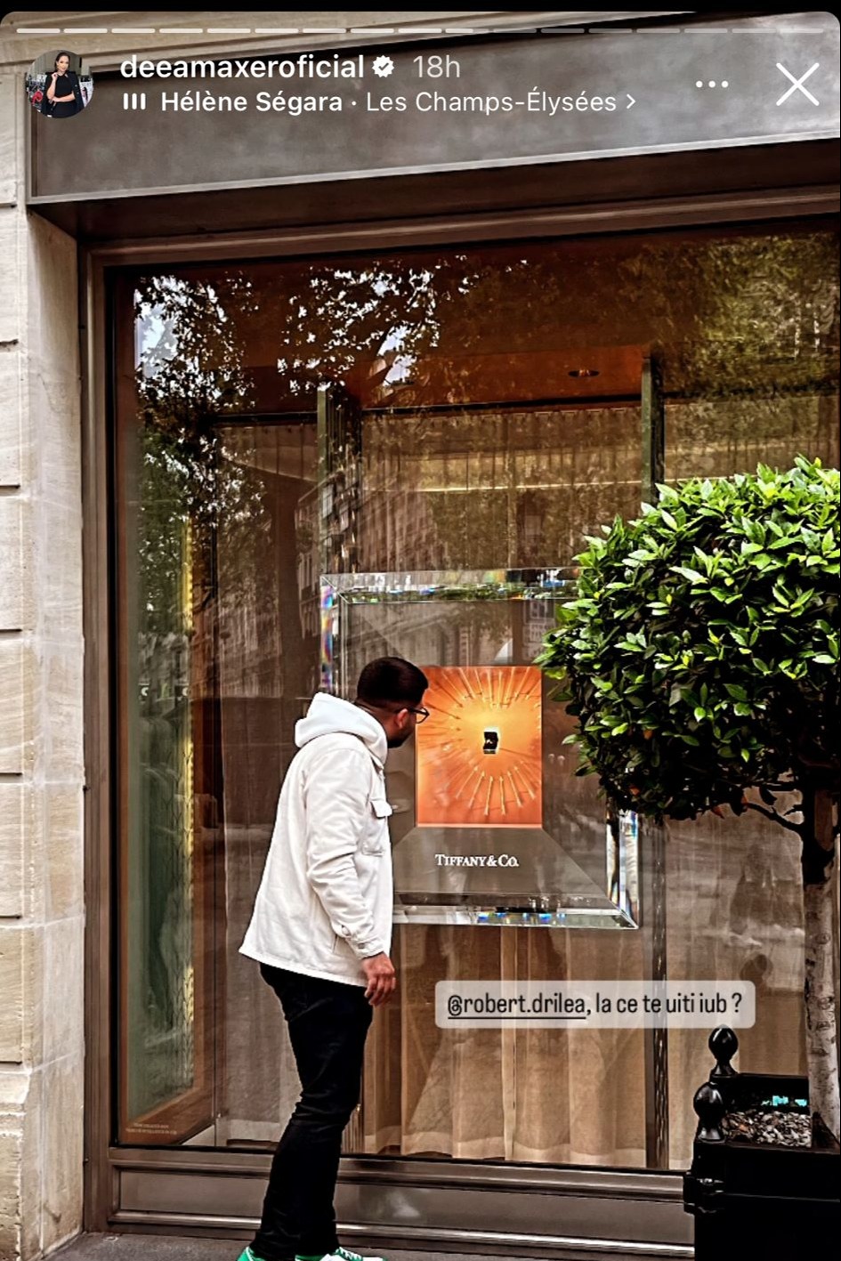 Iubitul ei pare să aibă alte gânduri pentru că, recent, chiar Deea Maxer l-a surprins în timp ce se uita în vitrina unui magazin de bijuterii. Și nu vorbim despre o bijuterie oarecare, ci despre una de brand, unde prețurile nu sunt deloc pentru oricine. Cei doi au fost plecați în vacanță la Paris, iar acolo artista l-a văzut pe Robert în timp ce analiza un inel, astfel că s-a gândit să imortalizeze momentul și să îl urce pe rețelele de socializare.