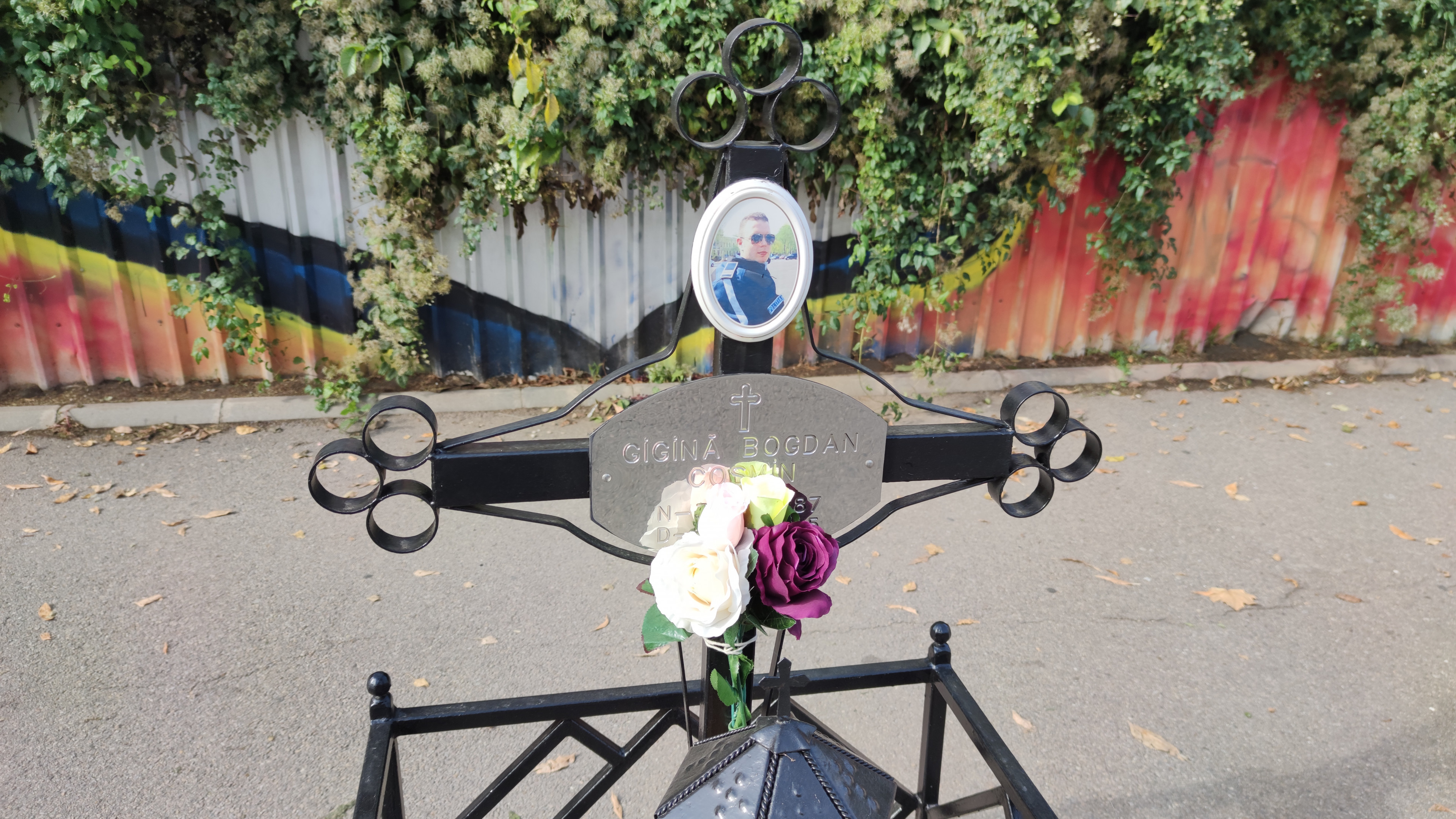 Ieri, însă, crucea lui Bogdan Gigină era din nou pe poziție, semn că părinții tânărului polițist au reușit să repare crucea metalică și s-o pună din nou în asfalt, în forma inițială. Ei au adus și un buchet de trandafiri pe care l-au prins de cruce. De asemenea, felinarul în care se așează candele era, ieri, închis cu un lacăt, probabil de teamă ca lumânările de acolo să nu fie furate.
