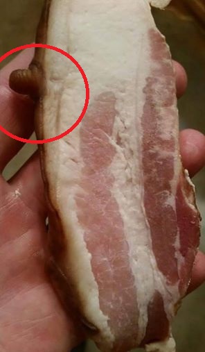 Mandy Pella a cumparat o bucata de bacon pe care se pregatea sa o gateasca. Inainte de a o pune la prajit in tigaie a observat ca pe o parte sunca avea un sfarc. Nu se stie daca provenea de la un mascul sau o femela, dar imaginea a fost suficienta pentru a-i amana ore bune senzatia de foame.