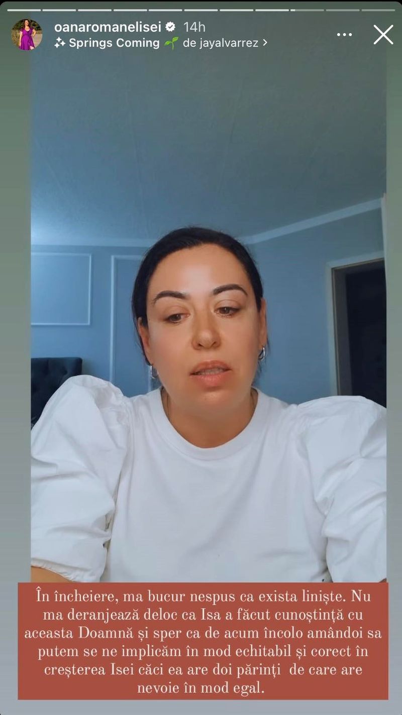 „Mă bucur nespus că există liniște. Nu mă deranjează deloc că Isa a făcut cunoștință cu această doamnă și sper ca de acum încolo amândoi să putem să ne implicăm în mod echitabil și corect în creșterea Isei, căci ea are doi părinți de care are nevoie în mod egal”, a povestit Oana Roman pe Instagram.