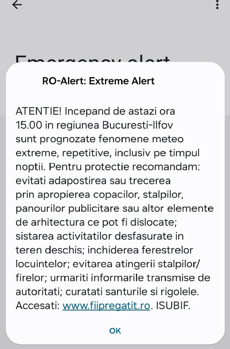 „ATENTIE! Incepand de astazi ora 15.00 in regiunea Bucuresti-Ilfov sunt prognozate fenomene meteo extreme, repetitive, inclusiv pe timpul nopții. Pentru protecție recomandăm: evitati adapostirea sau trecerea prin apropierea copacilor, stâlpilor, panourilor publicitare sau altor elemente de arhitectură ce pot fi dislocate; sistarea activităților desfășurate în teren deschis; închiderea ferestrelor locuințelor; evitarea atingerii stâlpilor/firelor; urmăriti informările transmise de autorități; curățați șanțurile și rigolele. Accesați: www.fiipregatit.ro. ISUBIF”, se arată în mesajul Ro-Alert.