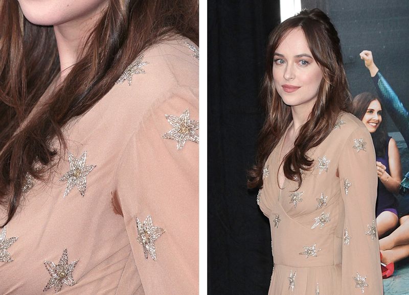 Dakota Johnson a dat-o-n bara rau de tot la premiera „How To Be Single”. Cu toate ca actrita a imbracat o rochie vaporoasa, deschisa la culoare, cu aplicatii in forma de stelute, un detaliu a stricat tot. Emotiile sau caldura excesiva au facut-o pe satena sa transpire.