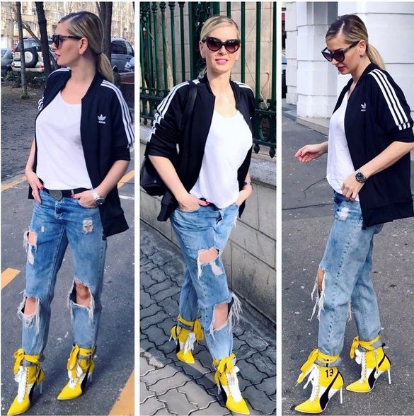 Îmbrăcată într-o pereche de jeanşi rupţi şi un top simplu, peste care a asortat o geacă bomber, Andreea a încălţat o pereche de botine galbene, ce au atras atenţia tuturor.