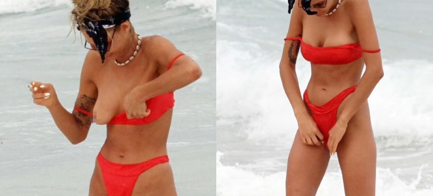 Din nefericire pentru ea, însă, s-a avântat în valurile puternice, ce au ”dezbrăcat-o”. Astfel, atunci când a ieşit din apă, tânăra a ieşit cu un sân la vedere, la fotografii au fost pe fază şi au surprins totul.