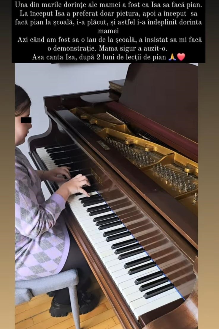 „Una din marile dorințe ale mamei a fost ca Isa să facă pian. La început Isa a preferat doar pictura, apoi a început să facă pian la școală, i-a plăcut și astfel i-a îndeplinit dorința mamei. Azi când am fost să o iau de la școală a insistat să-mi facă o demonstrație. Mama sigur a auzit-o. Așa cântă Isa, după 2 luni de lecții la pian.”, a scris Oana Roman, în dreptul unui videoclip cu Isabela cântând la pian.
