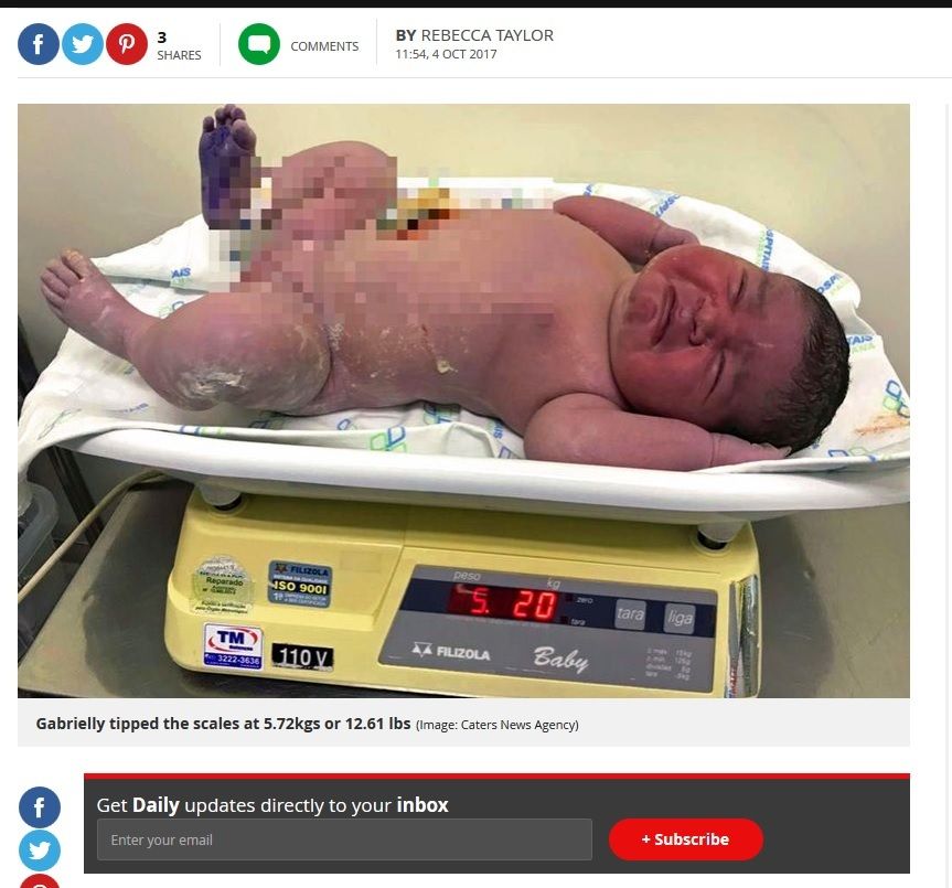 Maira Trevisan, mama a trei copii din Brazilia, a devenit o mica vedeta locala, dupa ce a adus pe lume o fetita uriasa. Micuta Grabriela s-a nascut cu o greutate de aproape 6 kilograme si masoara 54 de centimetri lungime. Medicii si asistentele au marturisit ca este prima oara cand vad un bebelus atat de voinic.