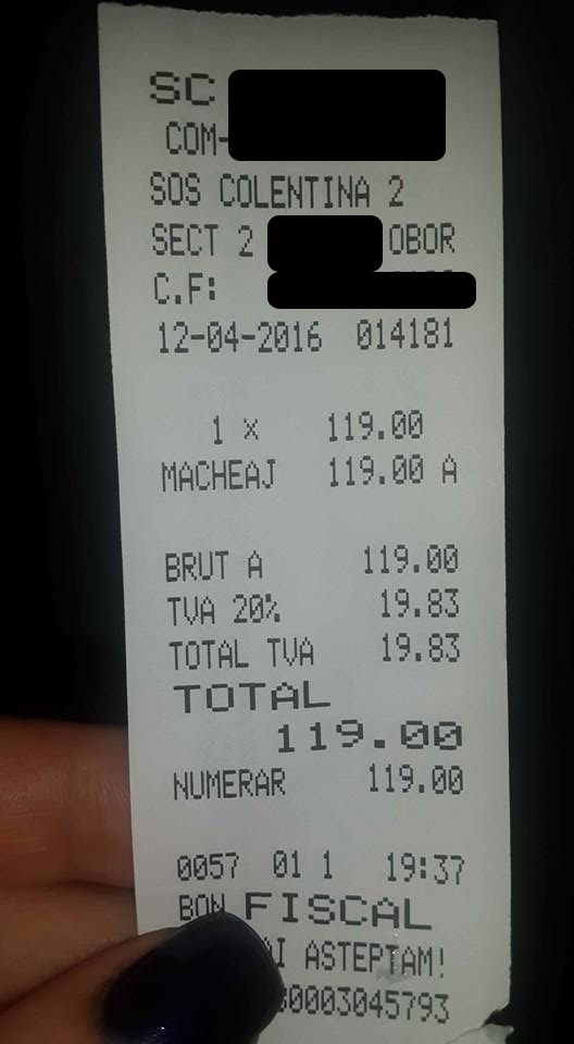 O internauta a postat pe net un bon fiscal obtinut de la un salon de infrumusetare din Bucuresti, situat in cartierul Obor din Capitala.