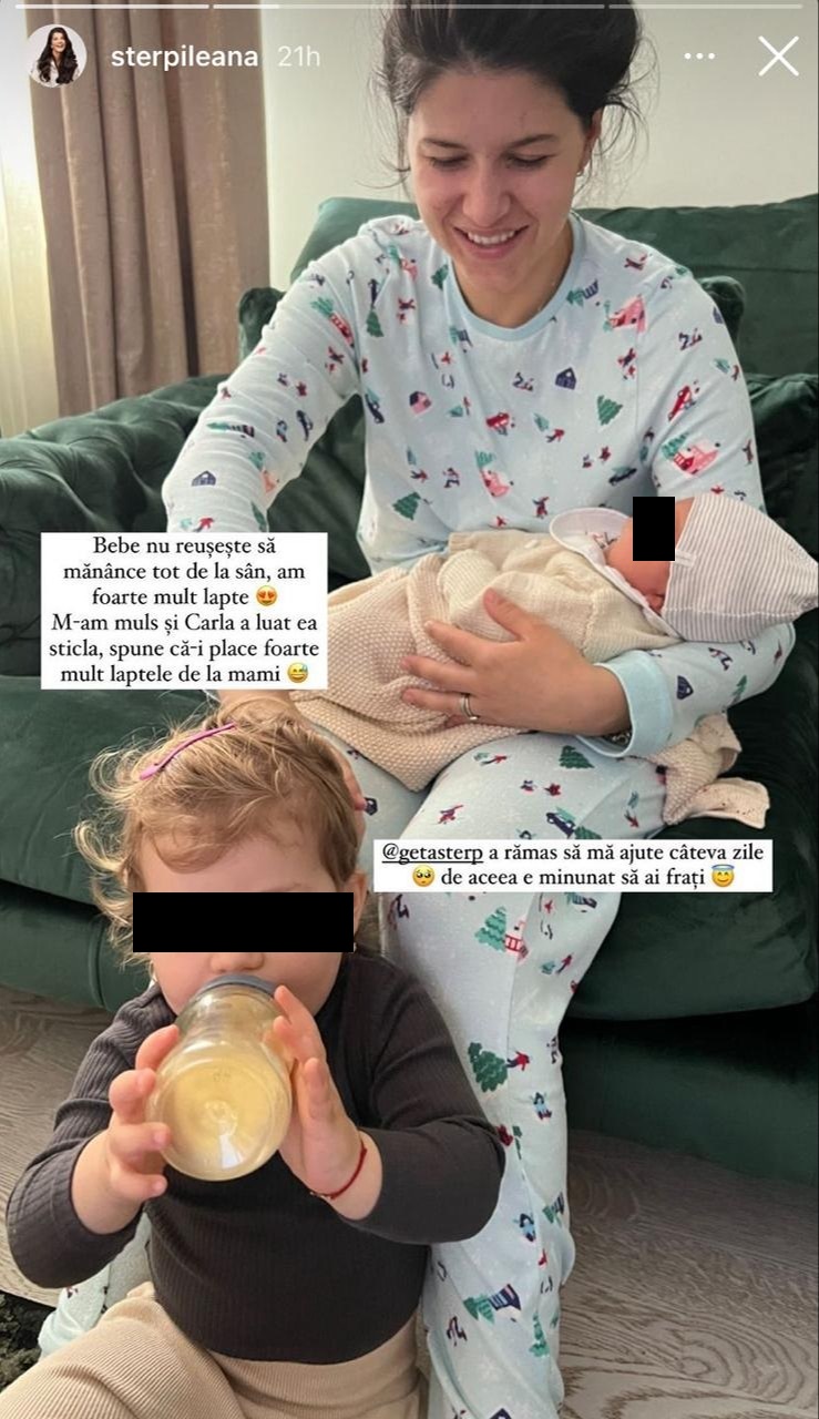 „Bebe nu reușește să mănânce tot de la sân, am foarte mult lapte. M-am muls și Carla a luat ea sticla, spune că-i place foarte mult laptele de la mami. Geta Sterp a rămas să mă ajute câteva zile, de aceea e minunat să ai frați.”, a spus Ileana Sterp în mediul online.