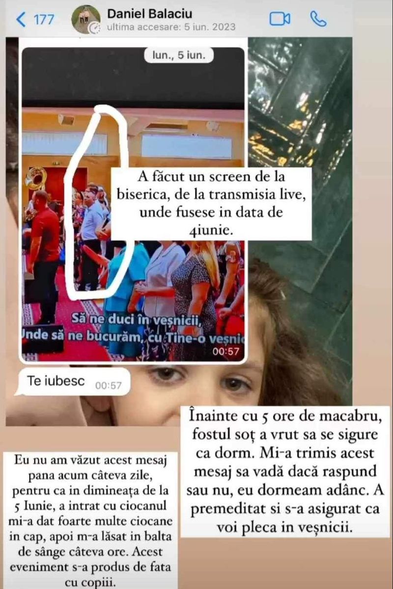 "A făcut un screen de la biserică, de la transmisia live, unde fusese în data de 4 iunie. Eu nu am văzut acest mesaj până acum câteva zile, pentru că în dimineața de la 5 iunie, a intrat cu ciocanul și mi-a dat foarte multe ciocane în cap, apoi m-a lăsat în baltă de sânge câteva ore. Acest eveniment s-a produs de față cu copiii. Înainte cu 5 ore de macabru, fostul soț a vrut să se asigure că dorm.