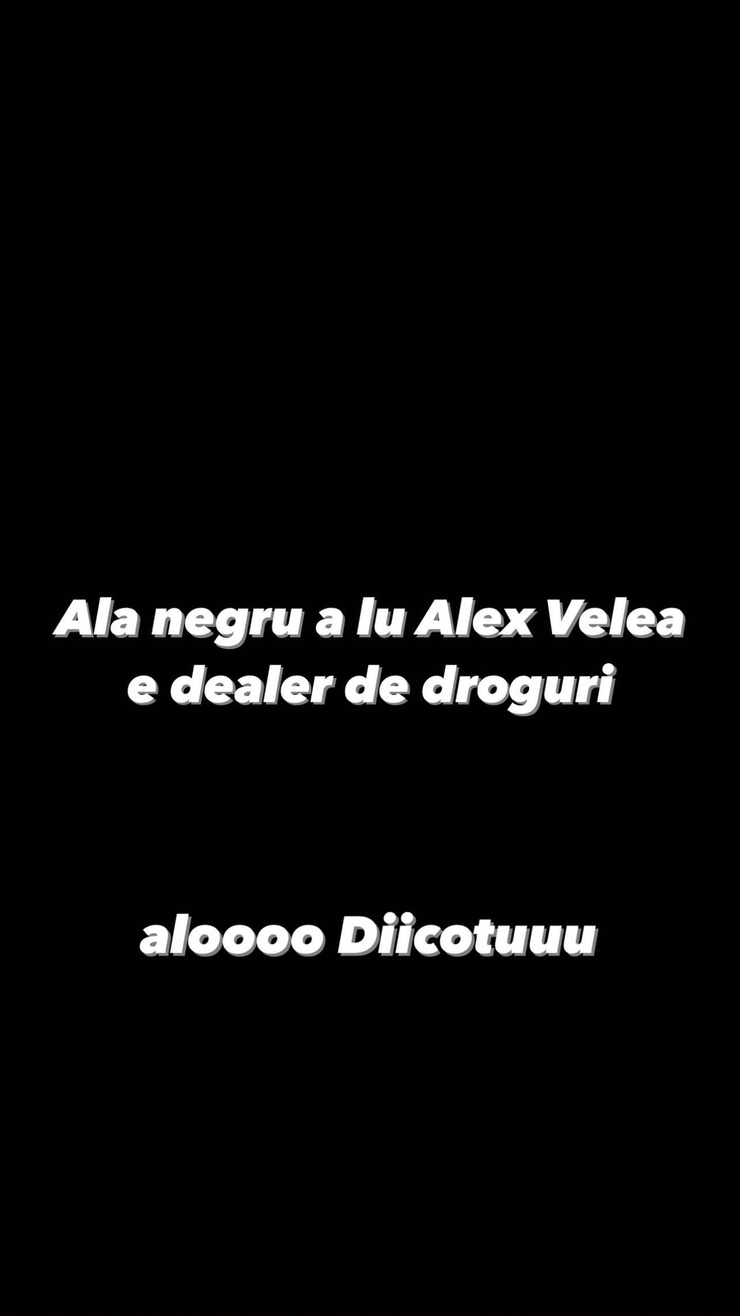 „Suntr stricat la stomac. Alex Velea m-a d****t. Ăla negru a lui Alex Velea e dealer de d*****i. Alooo, DIICOTUU”, a scris Abi Talent, la secțiunea de stories de pe Instagram. El a mai postat o captură de ecran, în care apare că a dat mesaj Poliției Române, pe pagina lor de Instagram, unde îi înștiințează de faptul că ar fi primit substanțe stupefiante din partea lui Alex Velea, motiv pentru care ar trebuie să se sesizeze.