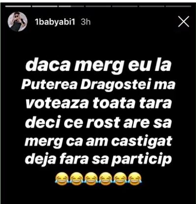 Abi, ”Regele României”, cum se autointitulează, a răspuns printr-un Instastory în care a dezvăluit că s-ar băga în acest show, deși premiul este unul prea mic pentru valoarea lui. El spune însă că poate fi deja declarat câștigător, pentru că va lua toate voturile.