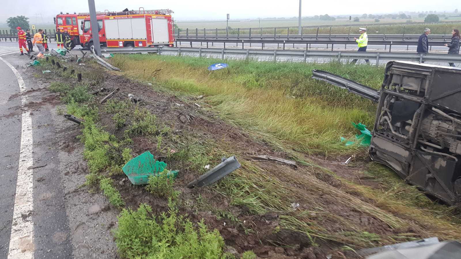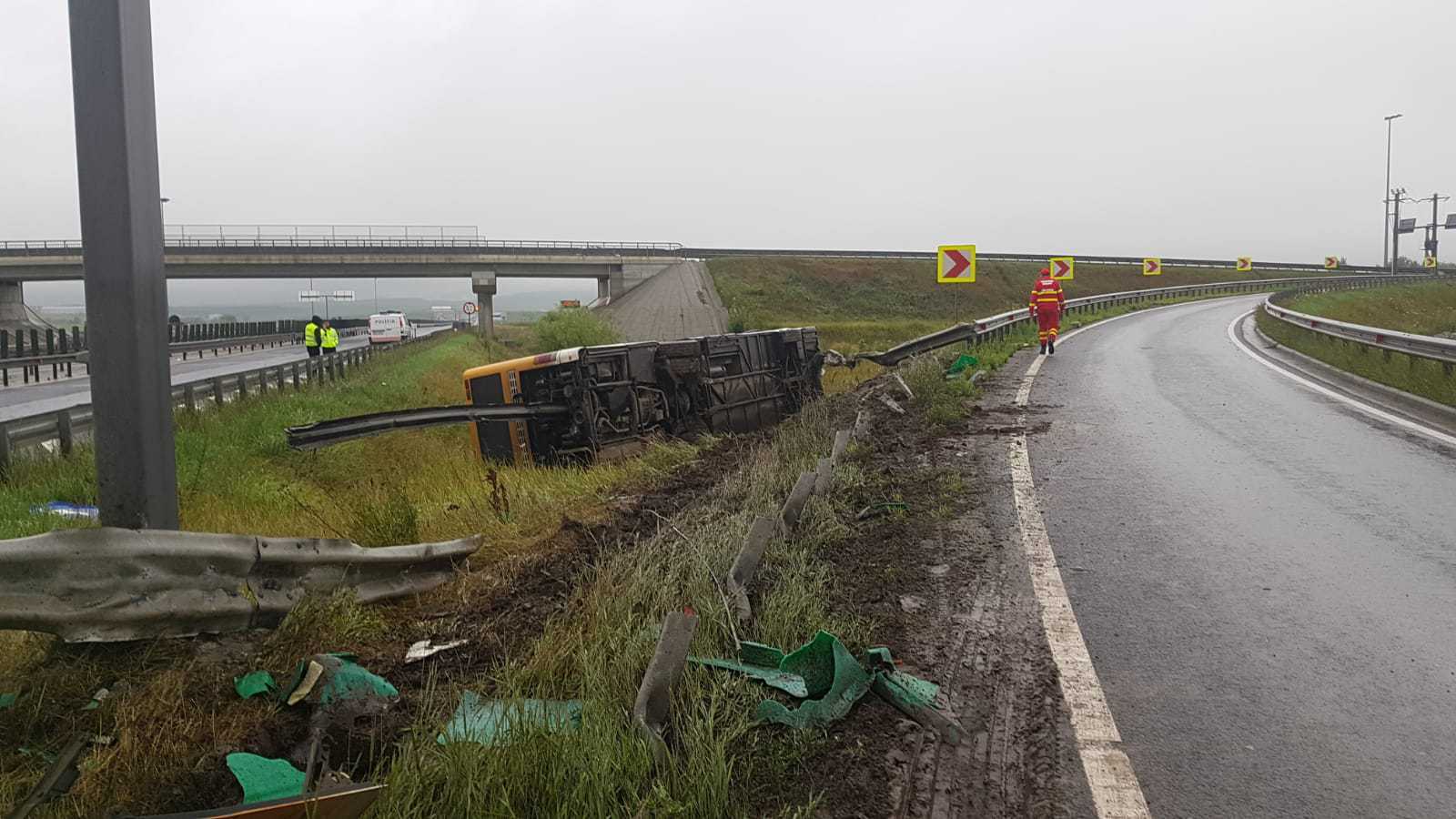 Un autocar în care se aflau 33 de persoane s-a răsturnat pe breteaua de ieşire de pe autostrada A1 Sibiu - Sebeş către aeroportul internaţional Sibiu, o persoană suferind leziuni grave, iar alte treisprezece, leziuni uşoare, anunţă Centrul Infotrafic al Poliţiei Române.
