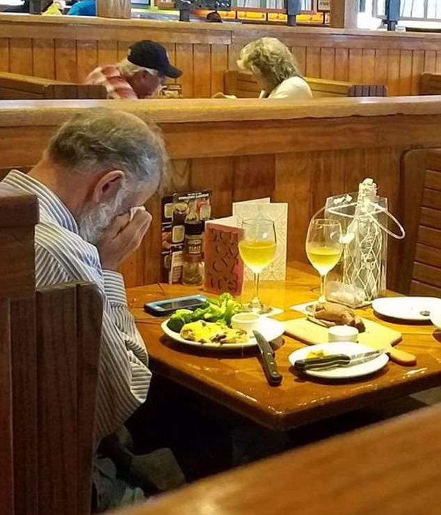 Este vorba de un barbat din Texas, SUA, surprins la masa, in oras. Barbatul era singur, iar in fata lui statea un recipient in care se aflau ramasitele sotiei sale.