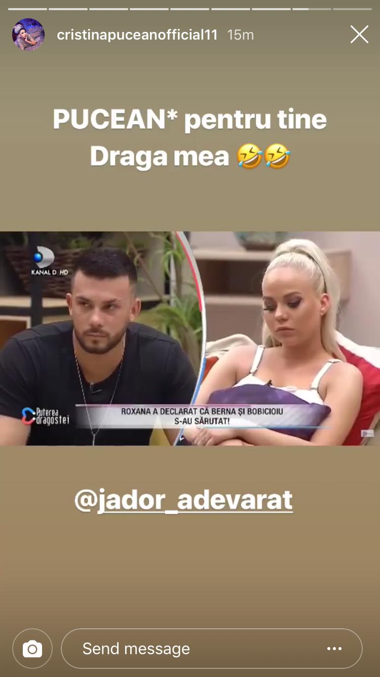 La scurt timp după afirmaţiile lui Bernadette, dansatoarea a reacţionat pe insta story." Pucean pentru tine, draga mea", a scris Cristina subliniind că Berna i-a greşit numele la emisiune.