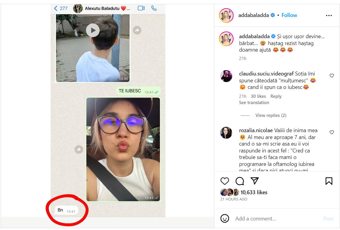 Adda se numără printre cele mai transparente artiste de la noi și nu s-a ferit niciodată să vorbească despre viața ei personală, inclusiv despre copilul ei. Artista și Cătălin Rizea sunt căsătoriți din anul 2016 și au împreună un băiețel în vârstă de 6 ani. De curând, aceasta a postat pe pagina ei de Instagram o conversație între ea și Alex, băiatul ei, care a stârnit amuzamentul fanilor.