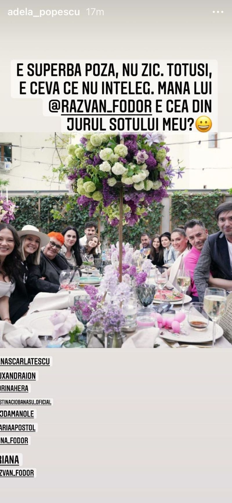 „E superbă poza, nu zic. Totuși, e ceva ce nu înțeleg. Mâna lui Răzvan Fodor e cea din jurul soțului meu”, a scris Adela Popescu în dreptul imaginii postate la InstaStory.