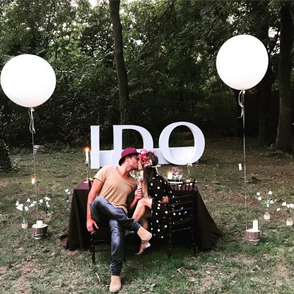 Copaci, aceeşi faţă de masă de in maro, pe mijloc iederă şi muşchi de copac, baloane mari albe, playlistul de la nuntă chiar şi o selecţia a meniului de atunci.