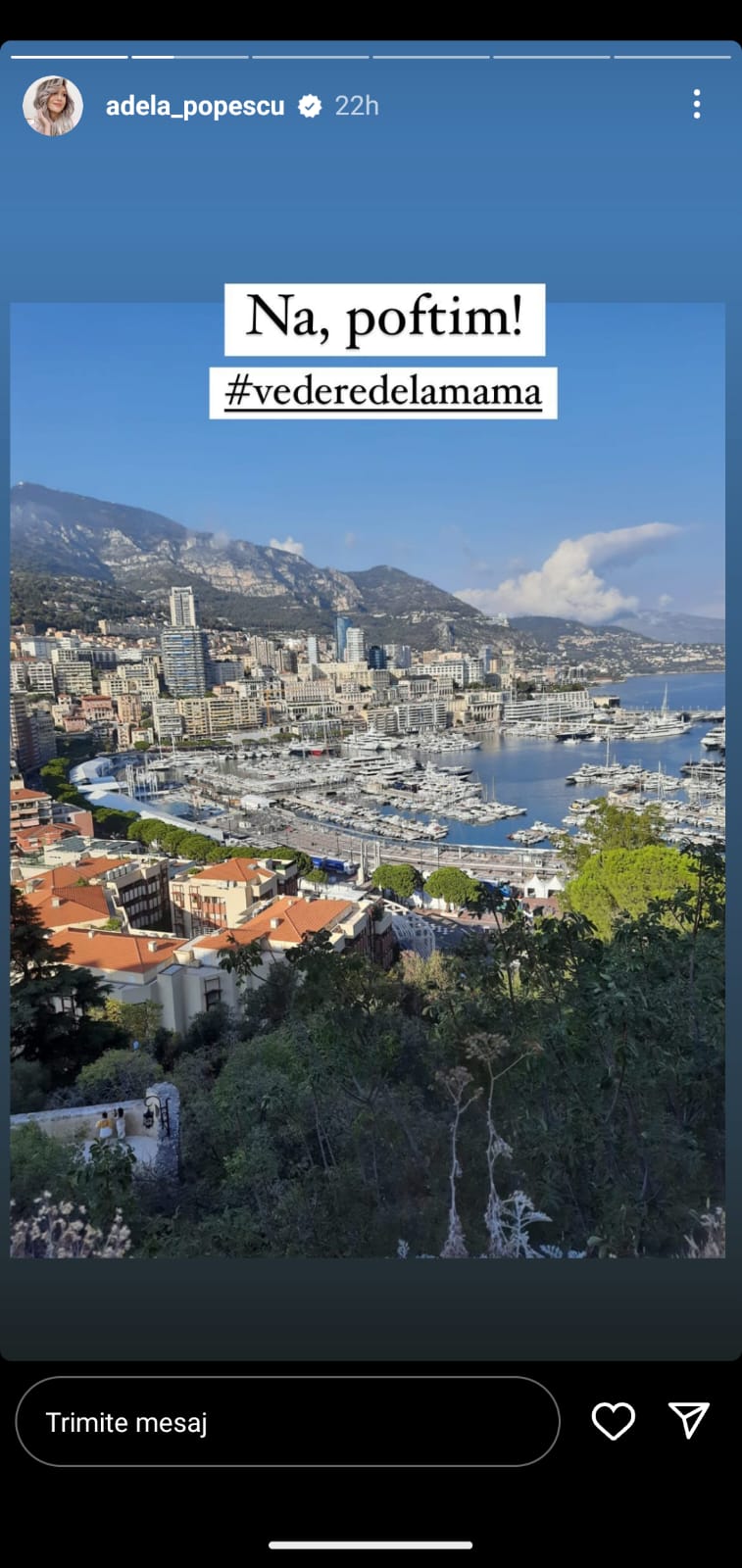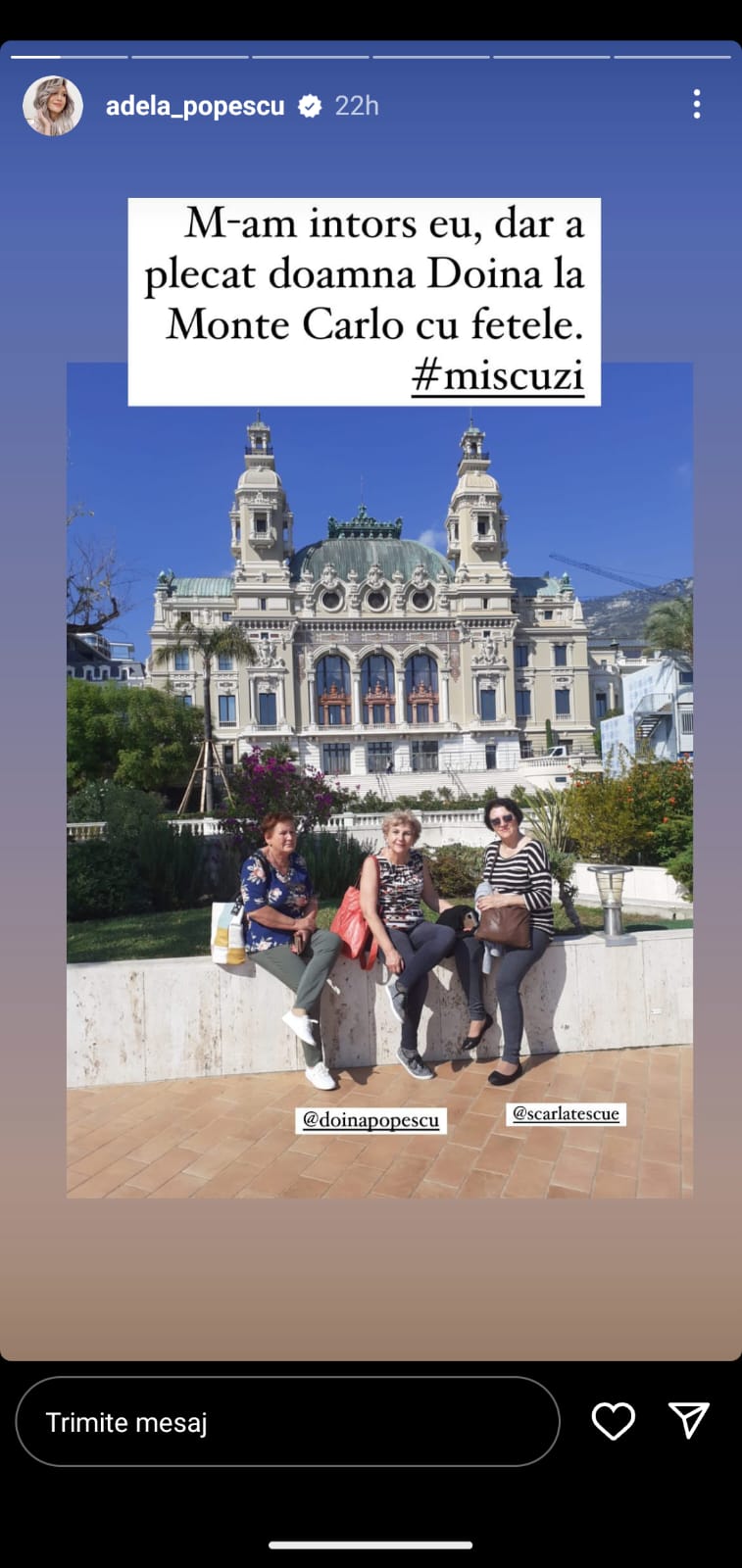 Adela Popescu a împărtășit cu fanii săi din mediul online faptul că mama sa se răsfață în aceste momente chiar la Monte Carlo, alături de prietenele sale, acest lucru întâmplându-se la scurt vreme de la întoarcerea sa în țară din Republica Dominicană, astfel că a simțit nevoia să o „pârască” pe doamna Doina admiratorilor ei de pe Instagram.