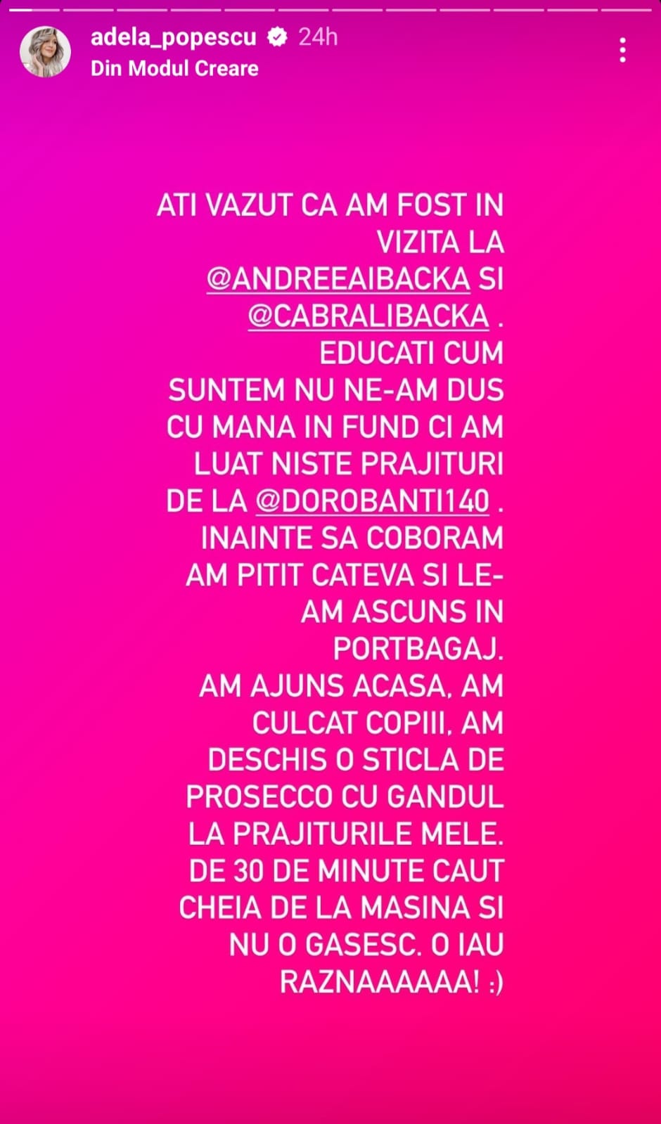 O susține chiar vedeta, care "i-a cerut socoteală" la primele ore ale dimineții lui Radu Vâlcan, după ce nu a mai reușit să găsească cheia mașinii: "Ați văzut că am fost în vizită la Andreea Ibacka și Cabral Ibacka. Educați cum suntem, nu ne-am dus cu mâna în f**d, ci am luat niște prăjituri. Înainte să coborâm am pitit câteva în portbagaj. Am ajuns acasă. Am culcat copiii. Am deschis o sticlă de prosecco cu gândul la prăjiturile mele. De 30 de minute caut cheia la mașină și nu o găsesc. O iau razna! Deci, ce-ai făcut cu cheia și unde mi-ai ascuns-o (n.r. către Radu Vâlcan)?