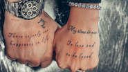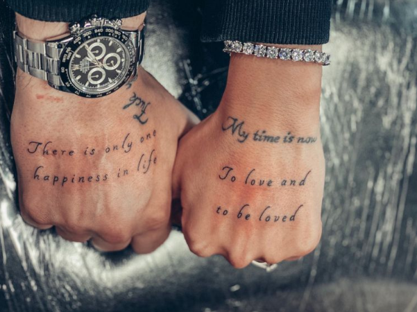 „There is only one happiness in life, to love and to be loved (n.r. – Există o singură fericire în viață, să iubești și să fii iubit)” este fraza care are o însemnătate aparte pentru celebrul cuplu. Jumătate din frază se află pe mâna lui Virgil, iar cealaltă jumătate se află pe mâna Adelinei, așa că adevărata semnificație a tatuajului lor poate fi înțeleasă doar atunci când ei sunt unul lângă celălalt.