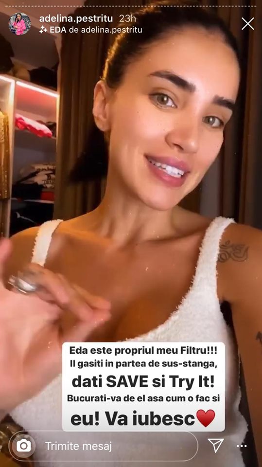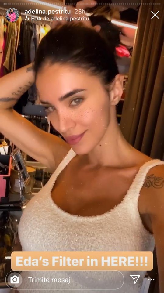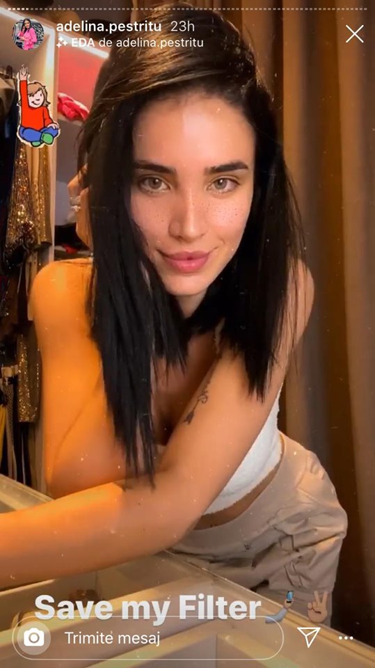 „Am lăsat surpriza asta pentru final de zi. Nu v-am spus nimic decât zilele trecute. Iată că acum puteți să folosiți chiar propriul meu filtru. Vi-l lansez în mod oficial. Îl găsiți în partea de sus al acestui Instastory, dați 'save' în telefon, apoi 'TRY IT' și vă puteți bucura de el așa cum fac și eu”, a spus Adelina Pestrițu pe Instastory.