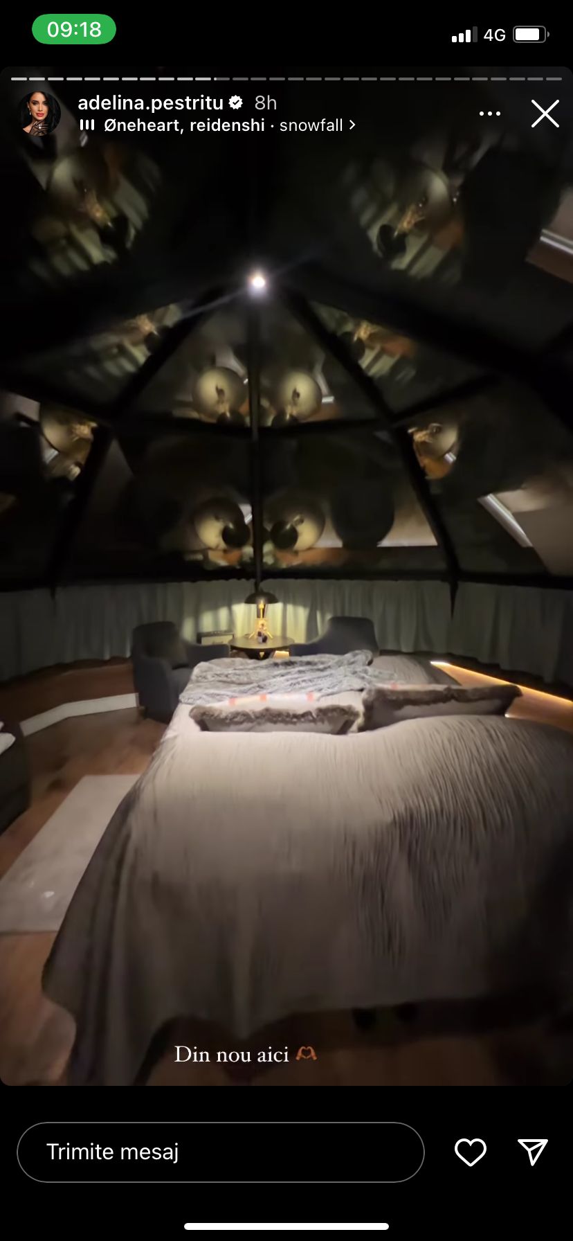 „Iar asta este priveliștea mea de acum. Suntem în igloo. Ai mei dorm, iar eu, evident, urmăresc Aurora Boreală, însă sunt slabe șanse să-și facă apariția astăzi. Ninge.”, a spus Adelina Pestrițu în mediul online.