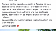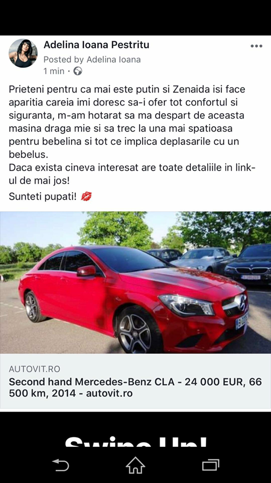 "Prieteni, pentru ca mai este putin se Zenaida isi face aparitia careia imi doresc sa-i foer tot confortul si siguranta, m-am hotarat sa ma despart de aceasta masina draga mine si sa trec la una mai spatioasa pentru bebelina si tot ce implic deplasarile cu un bebelus", a fost mesajul Adeline Pestritu.