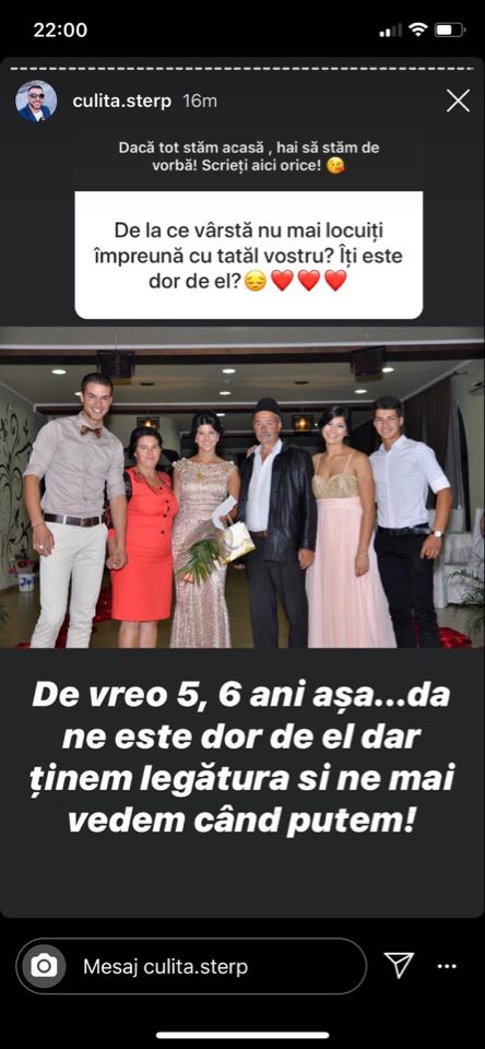 ”De vreo 5,6 ani așa… da ne este dor de el, dar ținem legătura și ne mai vedem când putem!”, a scris Culiță Sterp pe Instagram și a publicat o fotografie în care apare și tatăl lui.