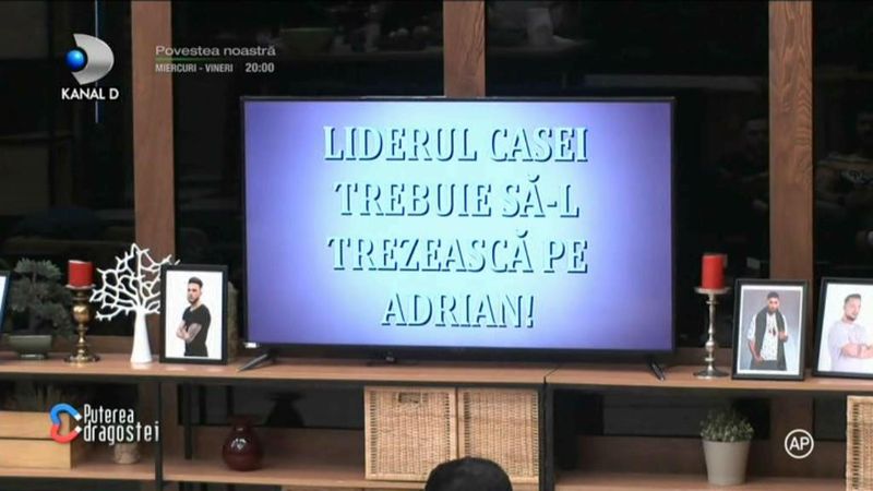 În ediția de astăzi, concurentul Adrian a dorit să se odihnească mai mult, căci, așa cum declarase și el în edițiile anterioare, ar pierde nopțile vorbind cu Larisa, tânăra pe care și-o dorește în viața lui, dar și în Casa Puterea Dragostei.