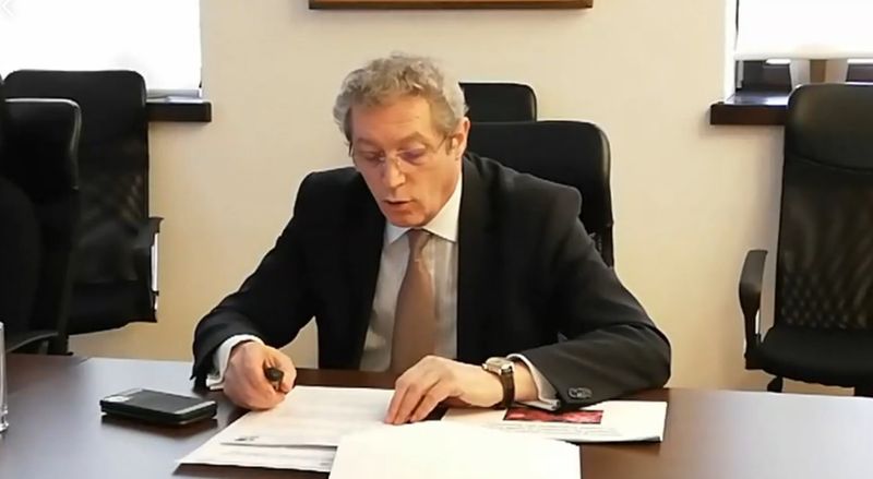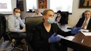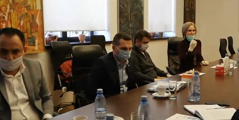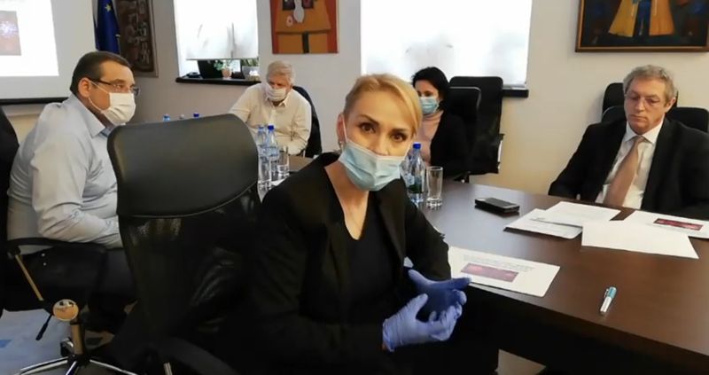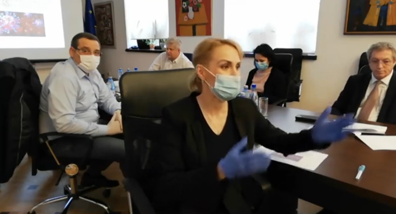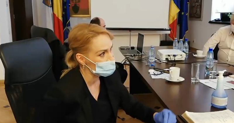 În imagini se vede cum într-o sală de ședință destul de mare, toți participanții poartă echipamente de protecție împotriva COVID-19 (Gabriel Firea are inclusiv mânuși), în vreme ce medicul, aflat în centrul încăperii, la o distanță destul de mic față de ceilalți, nu poartă nimic.
