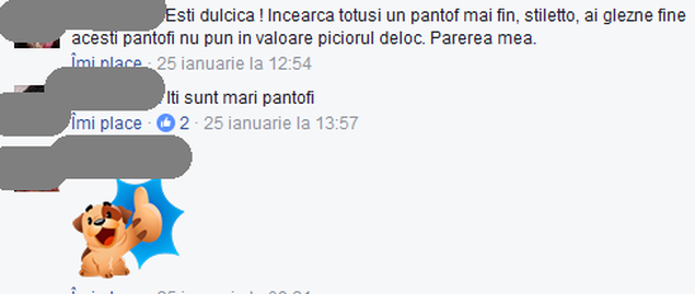 „Esti dulcica! Incearca, totusi, un pantof mai fin, stiletto, ai glezne fine acesti pantofi nu pun in valoare piciorul deloc. Parerea mea” sau „Iti sunt mari pantofii”, i-au comentat prietenele virtuale.