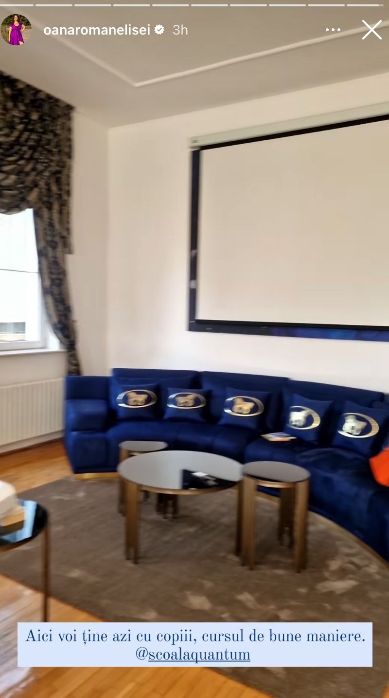 „Aici voi ține azi cu copiii cursul de bune maniere”, a scris Oana Roman în mediul online, arătându-le admiratorilor săi sala unde va avea loc cursul.