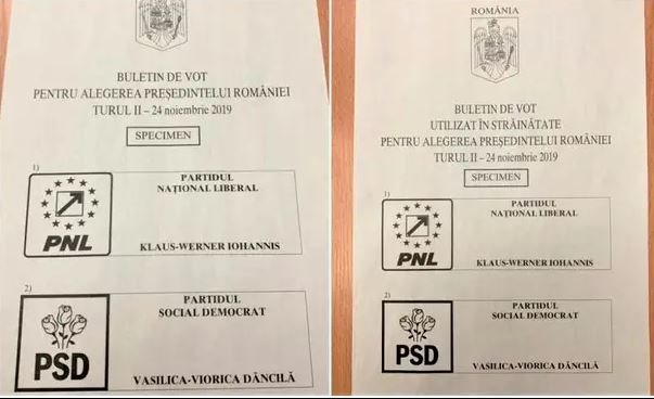 „Buletin de vot utilizat în străinătate pentru alegerea preşedintelui României turul 2 – 24 noiembrie 2019” şi „Buletin de vot utilizat în România pentru alegerea preşedintelui României turul 2 – 24 noiembrie 2019”. „Se va organiza al doilea tur de scrutin pentru alegerea Preşedintelui României în ziua de duminică, 24 noiembrie 2019, la care vor participa domnul Klaus-Werner Iohannis şi doamna Vasilica-Viorica Dăncilă, în această ordine“, a transmis şi Curtea Constituțională a României.