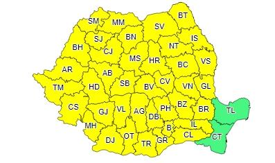 Avertizarea este în vigoare până miercuri, ora 23,00, și vizează întregul teritoriu al țării, cu excepția Dobrogei.