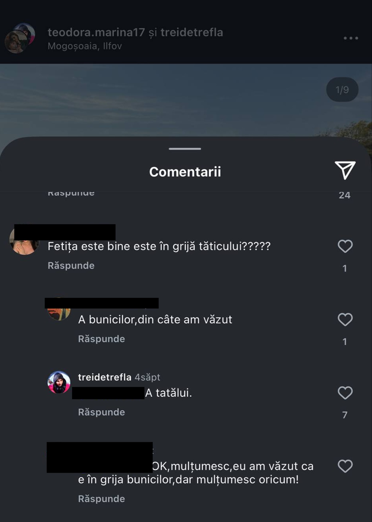 Comentariile apărute pe pagina unei postări comune cu Teodora sunt un barometru al empatiei colective. „Fetița este bine? Este în grija tăticului?” întreabă cineva. Altcineva răspunde: „A bunicilor, din câte am văzut.” Iar atunci apare el. Alex. Și pune punct speculațiilor cu patru cuvinte care valorează cât o viață de luptă: „Eu sunt tatăl.”