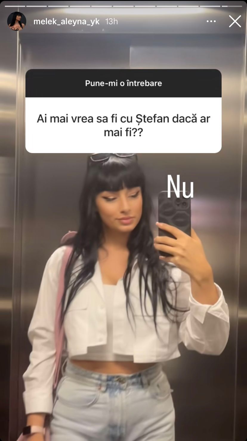 Recent, Aleyna a rupt tăcerea despre Ștefan, asta după ce a fost întrebată, pe pagina sa de Instagram, dacă și-ar dori să mai ofere o șansă relației cu tânărul. Bruneta a răspuns scurt și concis, mărturisind că nu mai vrea să se întoarcă în brațele fostului iubit.