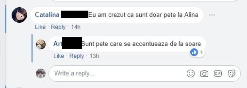 "Sunt pete de la soare. Nu vedeti bine", "sunt de la soare", "sunt pete", "mergi la oftalmolog, nu vezi bine", au aparat-o admiratorii.
