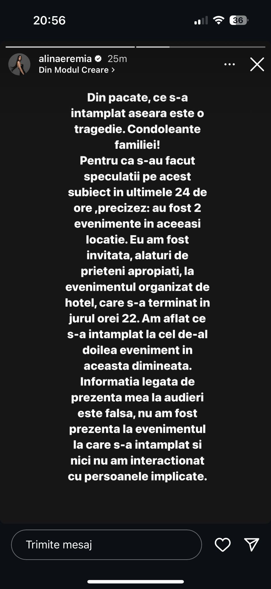 „Din păcate, ce s-a întâmplat aseară este o tragedie. Condoleanțe familiei! Pentru că s-au făcut speculații pe acest subiect în ultimele 24 de ore, precizeze: au fost două evenimente în aceeași locație. Eu am fost invitată, alături de prieteni apropiați, la evenimentul organizat de hotel, care s-a terminat în jurul orei 22. Am aflat ce s-a întâmplat la cel de-al doilea eveniment în această dimineață. Informația legată de prezența mea la audieri este falsă, nu am fost prezentă la evenimentul la care s-a întâmplat și nici nu am interacționat cu persoanele implicate.”, a spus Alina Eremia pe contul ei de Instagram.
