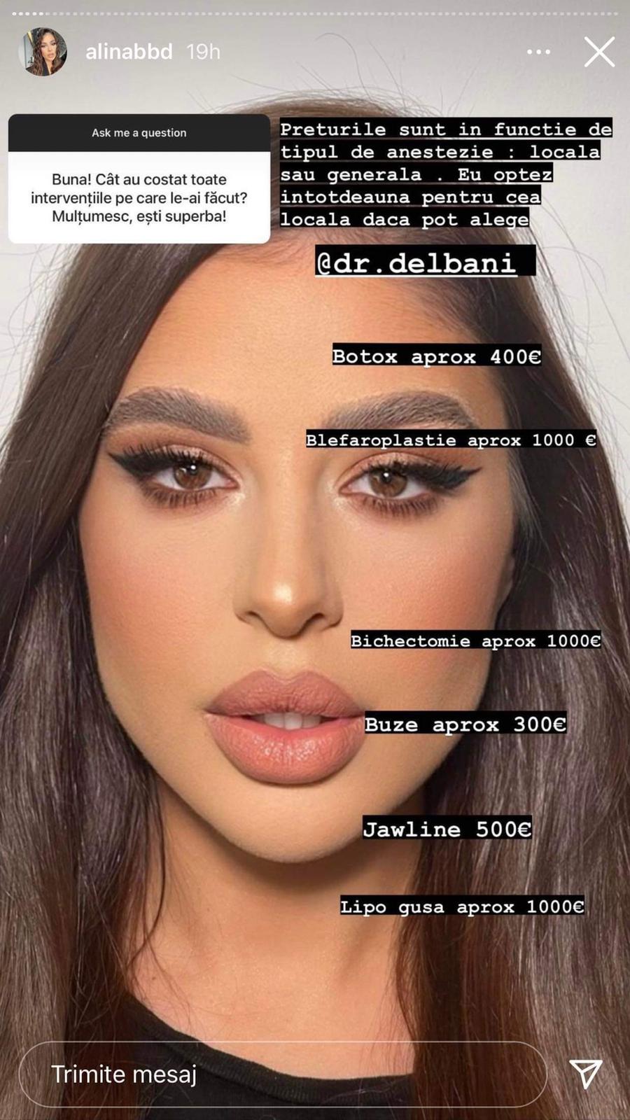 În primă fază, fanele au fost curioase să afle ce efecte secundare sau ce consecințe pot avea procedurile estetice, iar Alina a răspuns la toate întrebările în detaliu, fără să omită vreun amănunt semnificativ. O altă întrebare frecventă, pe care fanii i-au adresat-o Alinei a fost medicul estetician la care a apelat, dar și suma pe care a plătit-o.