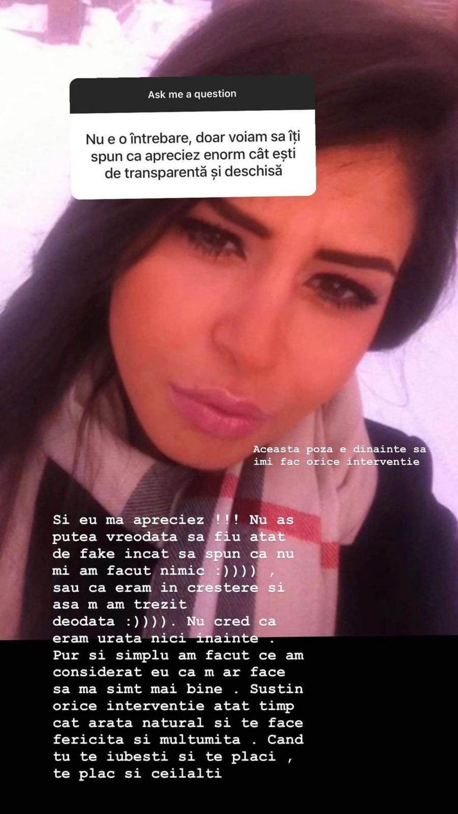 "Și eu mă apreziez!!! Nu aș putea vreodată să fiu atât fake încât să spun că nu mi-am făcut nimic:))) sau că eram în creștere și m-am trezit deodată:))) nu cred că eram urâtă nici înainte. Pur și simplu am făcut ce am considerat că m-ar face să mă simt mai bine. Suțin orice intervenție atât cât arată natural și te face să te simți ferictă și mulțumită. Când te iubești și te placi, te plac și ceilalți", a fost răspunsul Alinei.