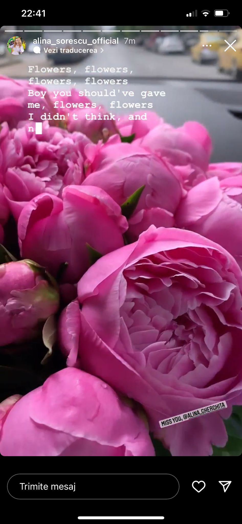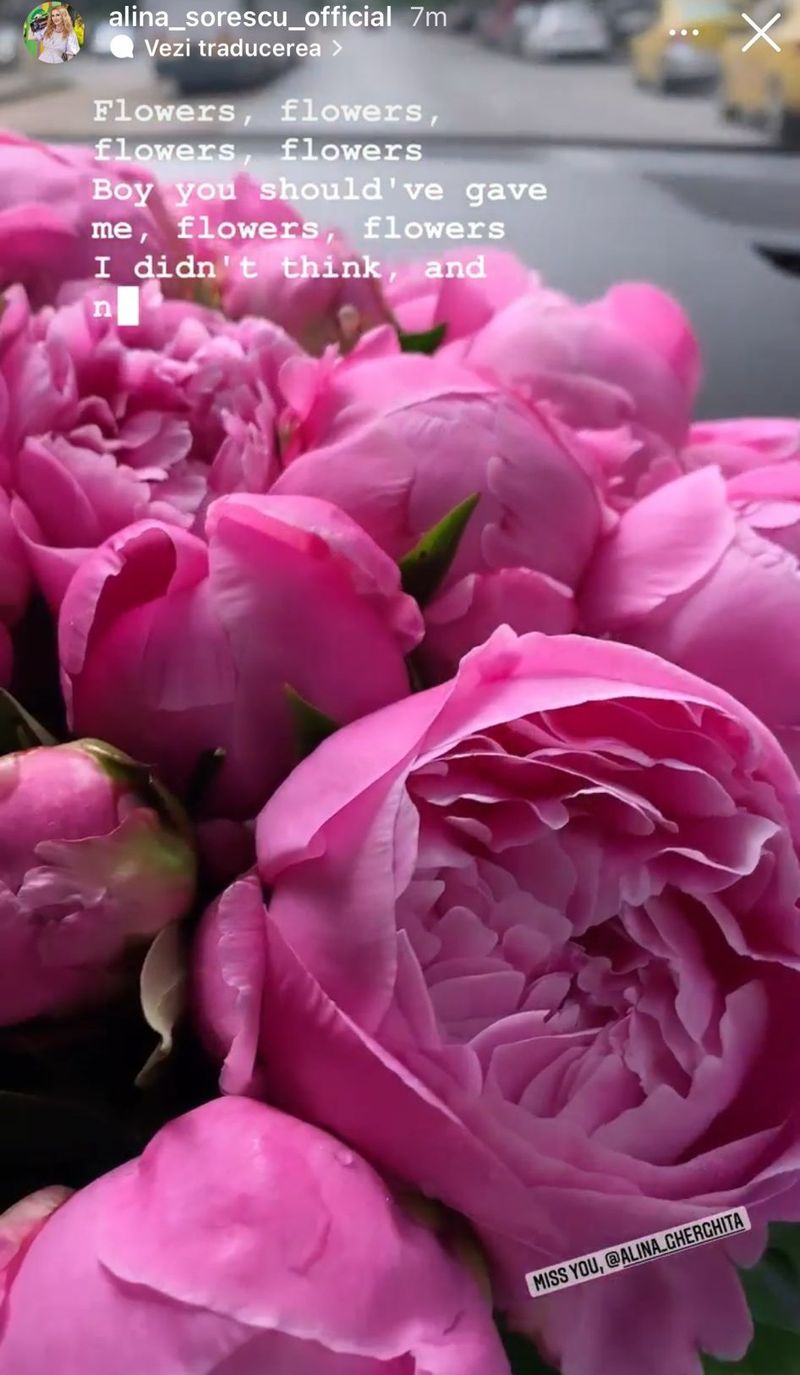 Ei bine, ultimele imagini cu Alina Sorescu de pe rețelele de socializare nu mai au nevoie de nicio descriere, căci se vede cu ochiul liber că aceasta pare să nu se lase afectată de divorțul de tatăl fiicelor ei și trăiește din plin fiecare moment. Recent, ea a primit un mare buchet de bujori și fără să stea pe gânduri s-a „lăudat” cu el pe rețelele de socializare: „Bujori în obrăjori”, a scris vedeta în dreptul imaginii în care ține buchetul. Ba chiar pe fundal a pus și piesa „Flowers” interpretată de Lauren Spencer Smith.