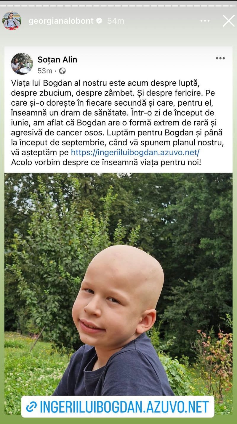 Georgiana Lobonț a făcut public cazul unui băiețel care se luptă cu o formă foarte rară și agresivă de cancer osos, care are mare nevoie de bani pentru a putea urma toate tratamentele și pentru a fi supus întregului set de proceduri medicale necesare pentru a i se da o șansă la viață.