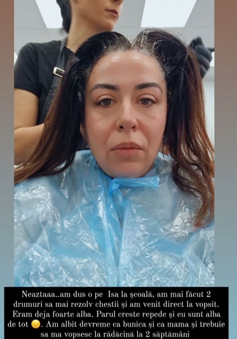 „Am dus-o pe Isa la școală, am mai făcut 2 drumuri să mai rezolv chestii și am venit direct la vopsit. Eram deja foarte albă. Părul crește repede și eu sunt albă de tot. Am albit devreme ca bunica și ca mama și trebuie să mă vopsesc la rădăcină la 2 săptămâni.”, a scris Oana Roman în mediul online.
