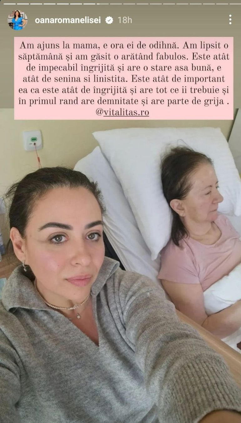 „Am ajuns la mama, e ora ei de odihnă. Am lipsit o săptămână și am găsit-o arătând fabulos. Este atât de impecabil îngrijită și are o stare așa bună, e atât de senină și liniștită. Este atât de important că este atât de îngrijită și are tot ce îi trebuie și în primul rând are demnitate și are parte de grijă.”, a scris Oana Roman în dreptul unei fotografii cu Mioara Roman.