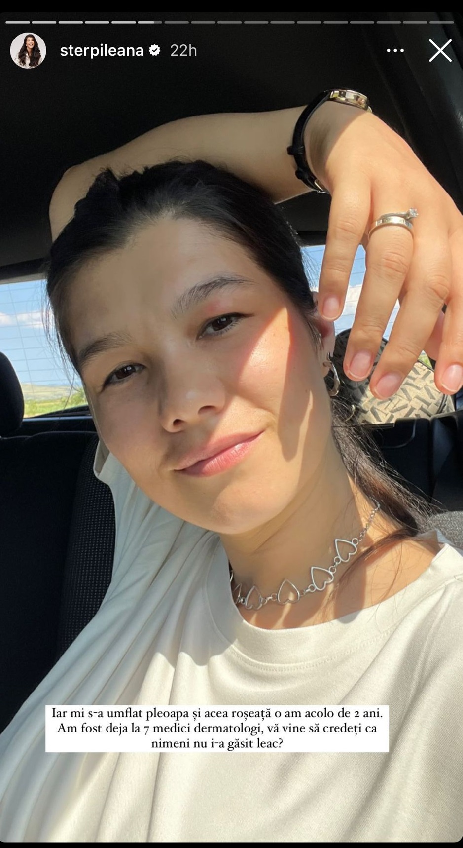 „Iar mi s-a umflat pleopa și acea roșeață o am acolo de doi ani. Am fost deja la șapte medici dermatologici, vă vine să credeți că nimeni nu i-a găsit leac?”, a mărturisit Ileana Sterp pe contul său de Instagram.