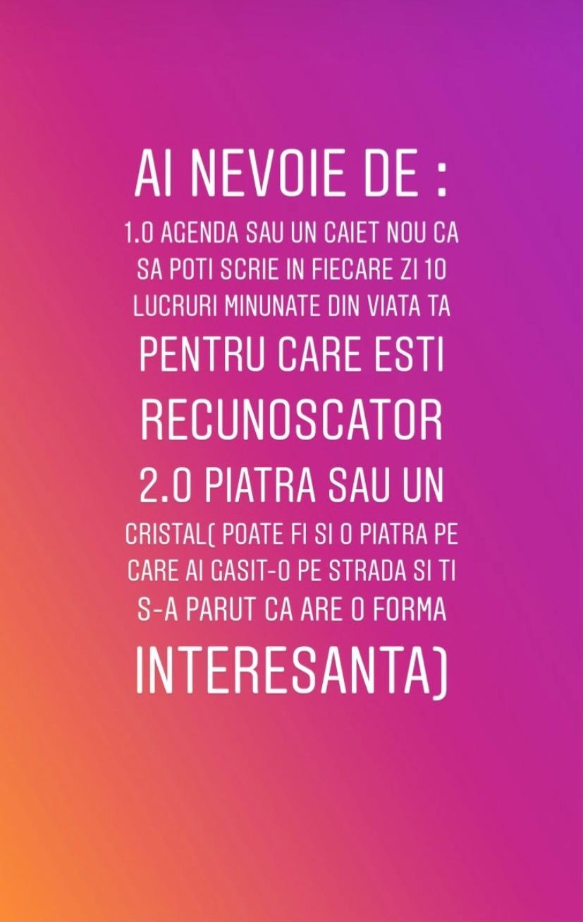 ”În fiecare zi simțeam că mă reechilibrez, am început să fac mișcare, mi-am schimbat alimentația și pur și simplu aveam o stare excelentă din toate punctele de vedere, psihic, fizic și emoțional. Jocul se regăsește în cartea ”The magic”, iar autoarea, Rhonda Byrne, a scris și celebra carte ”The secret”. Concluzia pe care am tras-o eu este că majoritatea afecțiunilor pornesc de la un conflict, de la o neîmplinire sau din pricina unei nemulțumiri profunde. Am salvat jocul pe Instagram, la repere, și am primit sute de mesaje de la persoane care au urmat programul și și-au schimbat viețile complet, în bine, după ce au fost în pragul divorțului sau în alte situații în care simțeau o presiune toxică. Până și sora mea l-a făcut, iar ea nu credea deloc în el, inițial”, a mai spus Elena.