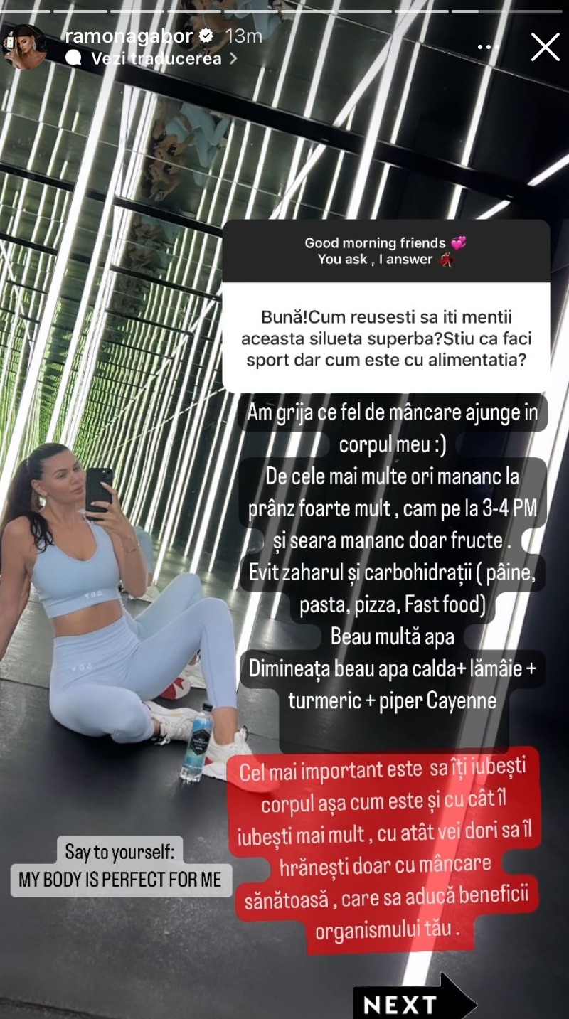„Bună! Cum reușești să îți menții această siluetă superbă? Știu că faci sport, dar cum este cu alimentația?”, a fost întrebarea pe care Ramona Gabor a primit-o din partea unei admiratoare.