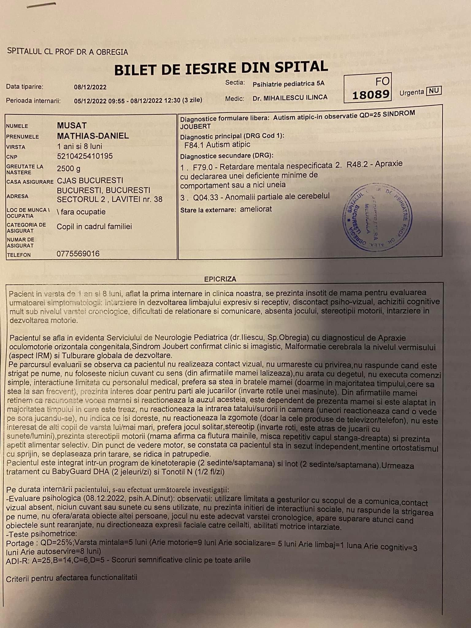 „Bună tuturor. În urma cu 1 an și 9 luni, am născut un băiețel care părea perfect sănătos, dar, cu timpul, am aflat că suferă de multiple afecțiuni. Ca urmare, diagnosticele fiind: apraxie, oculomotorie, sindrom joubert, autism, atrofie musculară, retard sever, sindrom gorlin (predispus la tumori ale pielii). Din cauza multiplelor diagnostice primite și totuși neavând un răspuns concret din partea medicilor și anume de ce nu se dezvolta, băiețelul nostru, deși are 1 an și 9 luni, fizic arata ca și vârsta de 6 luni.
